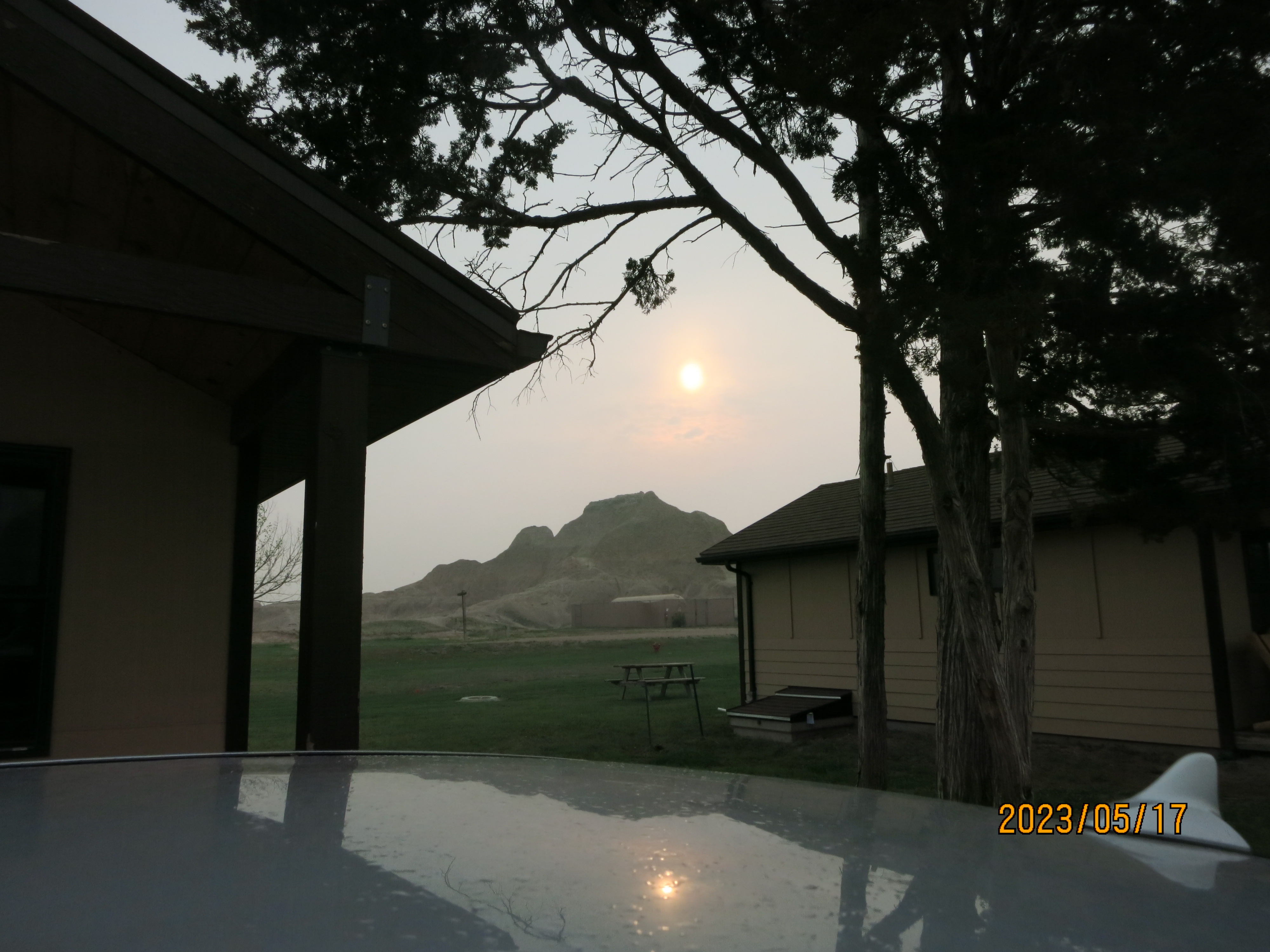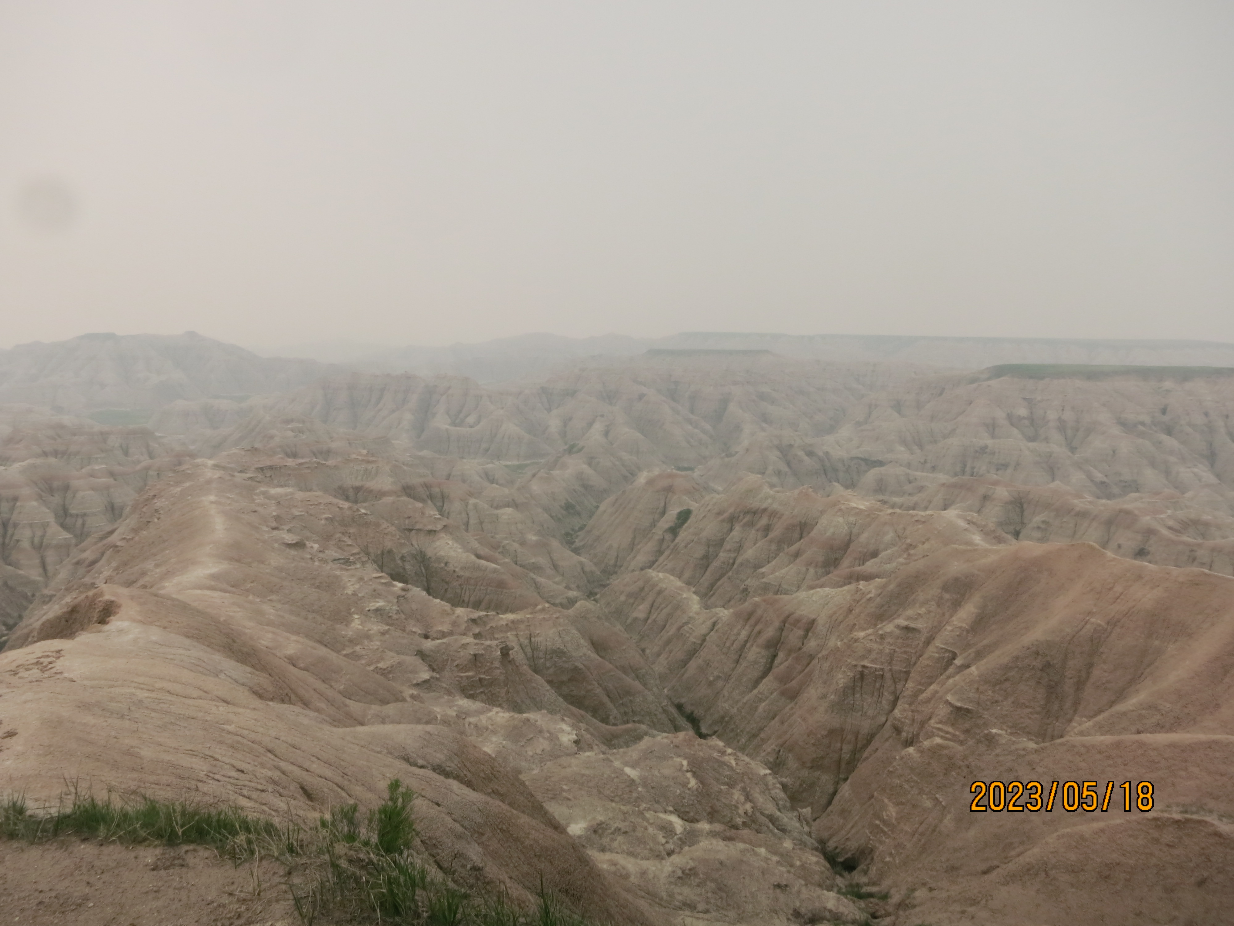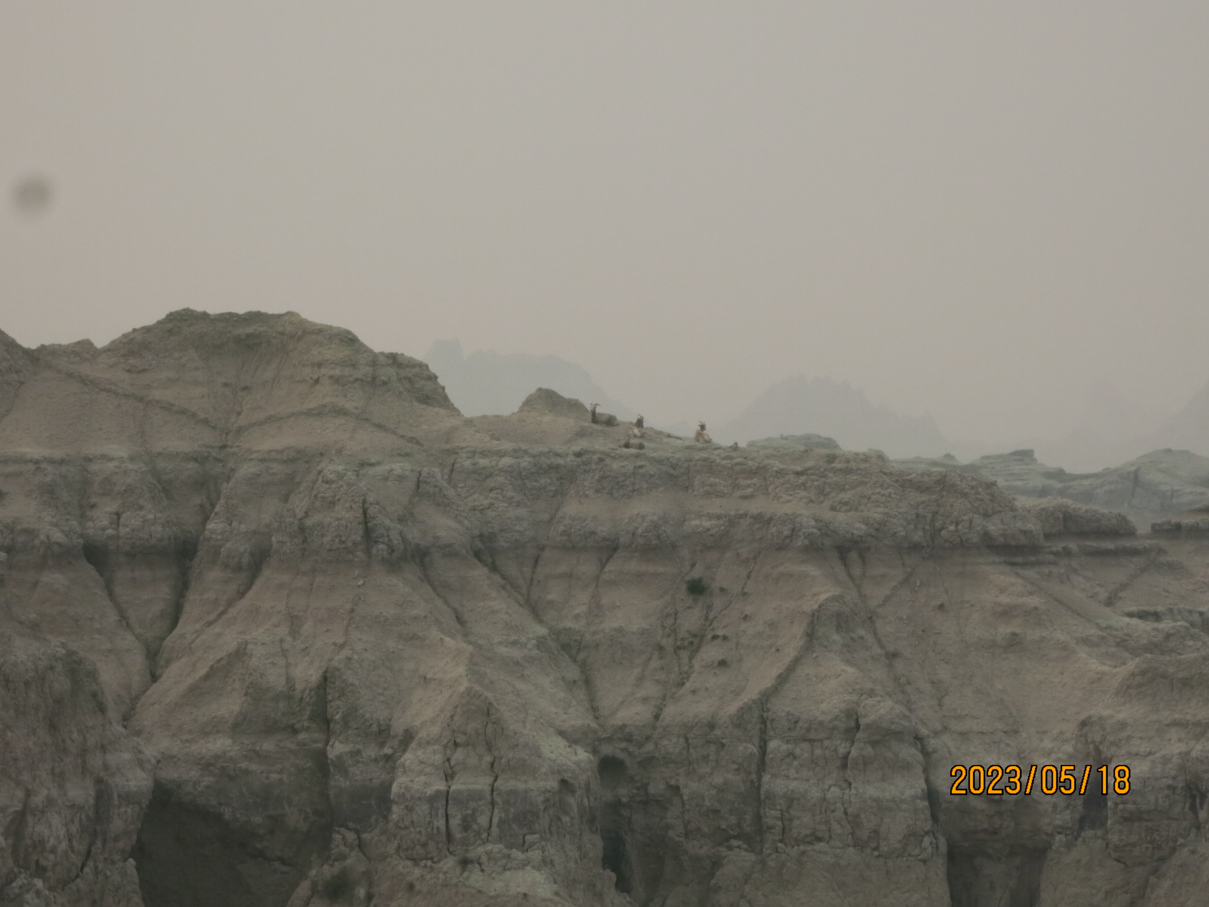 The views this morning in Badlands National Park were obscured by much of the smoke from the Alberta fires, which was disappointing but also offered a unique view of the park – especially with many of the formations disappearing into the haze of the sky.