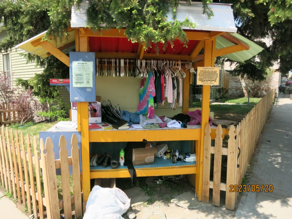 From there I walked around the town a little more to the riverside park. The thing that stuck out to me the most was that the water in the river was moving so fast people were surfing and paddle boarding! There was also this cool street corner store which had stuff that was all free.