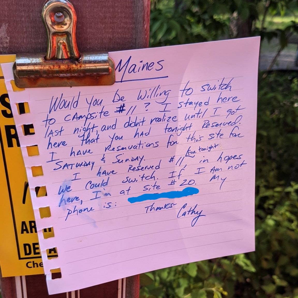 I saw that the spot reserved had this note written on the post explaining that someone had accidentally forgotten to book that spot and was staying there the whole weekend. They instead reserved me a new spot, which was much nicer than the one I was originally going to stay at. Thanks, Cathy!