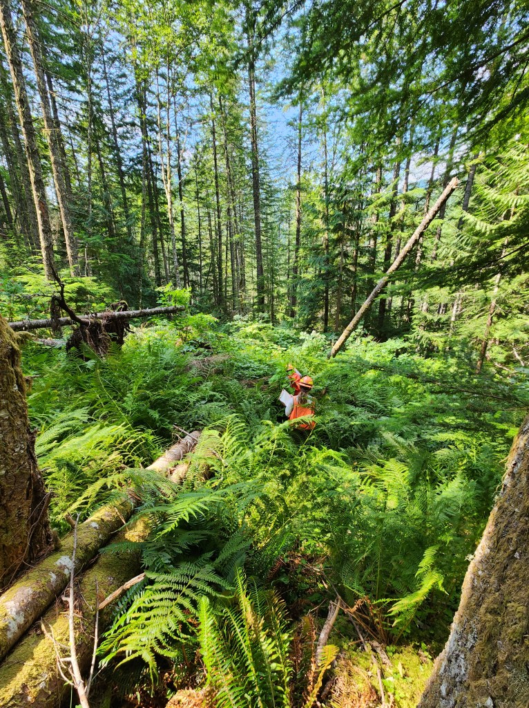 My final week of work was spent traveling to nearly the Canadian Border doing Stand Exams (click that link for a 96-page PDF all about stand exams). Essentially, it’s similar to cruising for sales, which I talked about in an earlier blog. We went around various plots and collected data about tree species composition, diameter, height, and seedling/sapling composition of an area. This is important to the zone silviculturist because she needs that data to write thinning prescriptions for future timber sales!