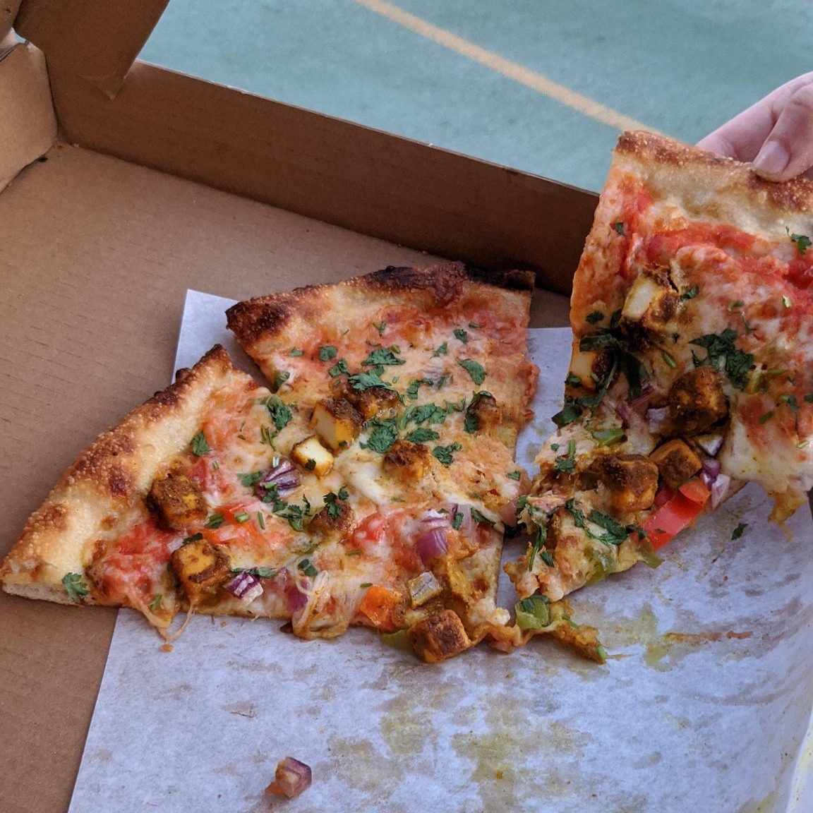 When we got done kayaking, we stopped for dinner at a place we thought was a real restaurant but was actually a virtual restaurant, which doesn’t have a seating area and only caters to takeout orders. What appealed to us was that they made Indian pizza with curry and paneer, and it was pretty dang good!