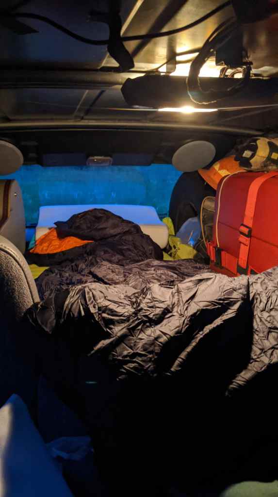 I had a lovely evening walking around and hiking in the grassland nearby the trailhead. There were tons of cool flowers and some big trees. It was good to have my first day of driving done too. I was able to relax and fall asleep pretty easily in my setup despite all of the stuff in my car.