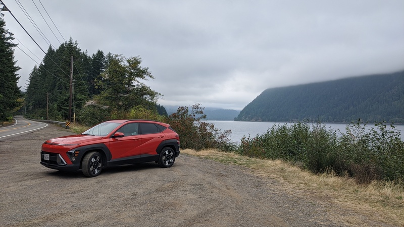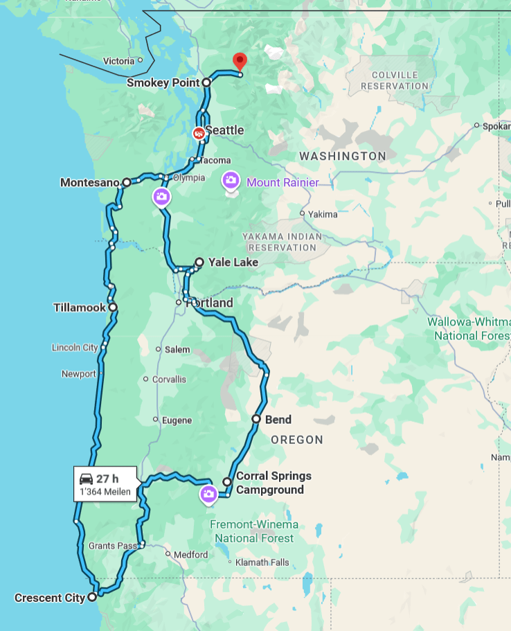 Here’s the route I took over the course of 5 total days of driving. I picked up my rental car from Smokey Point, which is near Darrington. It was a 2025 Hyundai Kona, which ended up being a really good car for this trip. I ended up sleeping in the back just like the XJ, but it wasn’t quite the same. My main complaint is that the back seats don’t fold all the way flat – so when I sleep in the back, there’s a bit of elevation gain around my hips! Otherwise it worked out nicely – just without the extra storage space the XJ gives me.